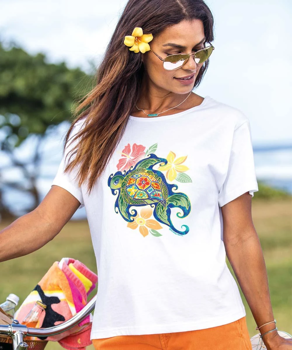 We’re known for our designs featuring flowers and sea turtles but this new creation takes this classic pairing in a fun direction. A playful Honu is the lively and lighthearted star of the design with the flowers carrying this cartoony creature through an ocean of good times. Made from 100% cotton that is ring-spun, then combed to make it luxuriously soft, this tee also features a scoop neck with a relaxed cut to be both cute and comfortable. We only use environmentally friendly water-based inks that penetrate the material’s fiber resulting in more vibrant colors, softer feel and artwork that doesn’t crack or peel. Plus, it is proudly printed in the United States for quality you can see and designs that stand the test of time.