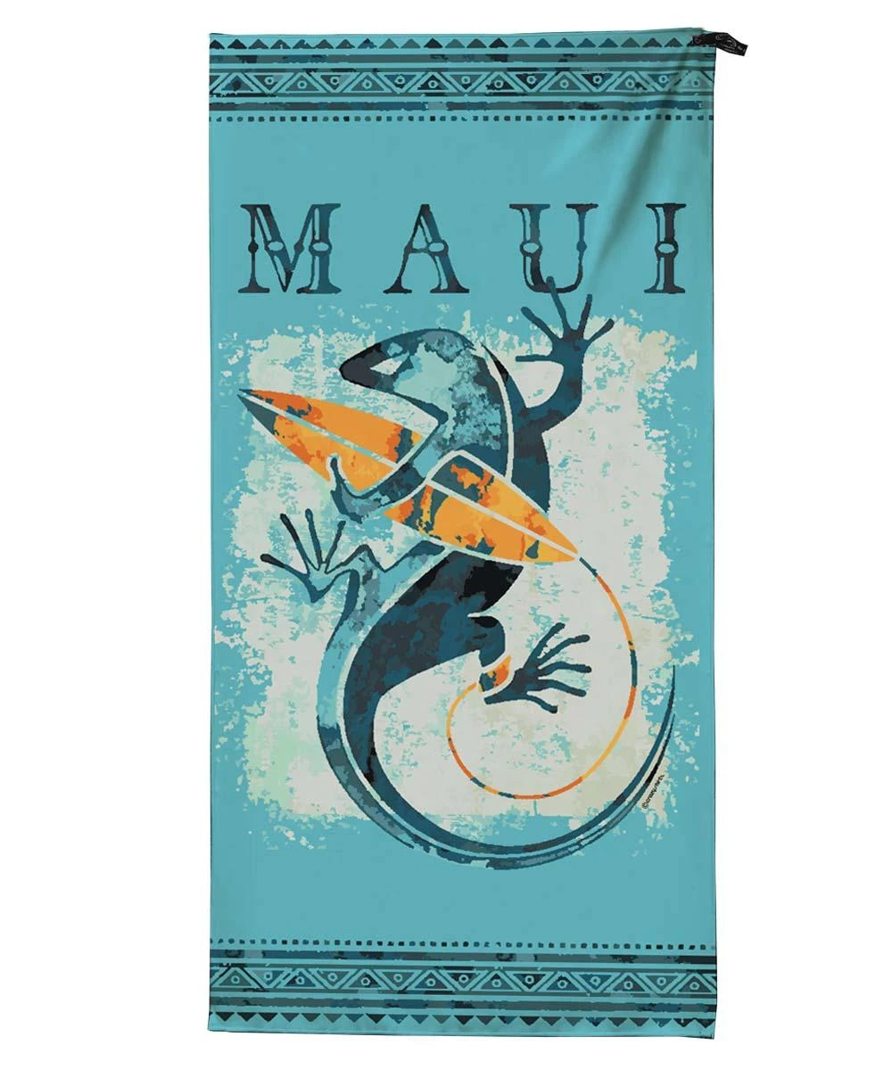 Geckos are guardian spirits in Hawaiian lore. Like a true local, this cool cat looks like he is guarding his favorite surf break. This towel is made with plush microfiber material that’s oh so soft against your skin and dries super-fast so, when it’s time to leave, your stuff doesn’t get damp. Extra long and wide, it’s great for laying out and, unlike terry towels, it won’t trap sand so you’ll get less in your bag, car and home. It has great Crazy Shirts graphics and comes in its very own tote to make a day by the water even more fun and easy. Towel measures 63″L x 31″W. Printed pouch measures 6″L x 9″W
