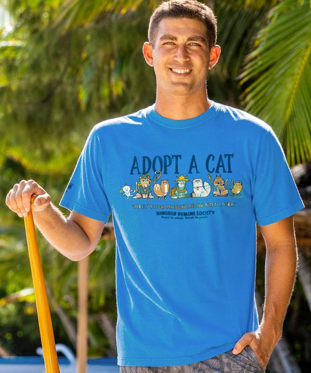 For every type of cat that’s out there, there is a human that is the perfect match. Go to your shelter and find your soul mate today. And don’t forget to wear this shirt to remind everyone else their special friend is waiting too. For Over 40 years, we’ve collaborated with the Hawaiian Humane Society and its mission to help island animals live healthy, happy lives. Wear your heart on your sleeve and celebrate furry friends with our Adopt-A-Cat Tee Collection. Made from 100% combed ring-spun cotton and featuring 50+ SPF protection, this tank will keep you feeling cool, calm and protected all summer long. The unique color comes from our specialty dyeing process that uses real Blue Curacao liqueur just like you’ll find in a Blue Hawaii drink.We only use environmentally friendly water-based inks that penetrate the material’s fiber resulting in more vibrant colors, softer feel and artwork that doesn’t crack or peel. Plus, it is proudly printed in the United States for quality you can see and designs that stand the test of time.