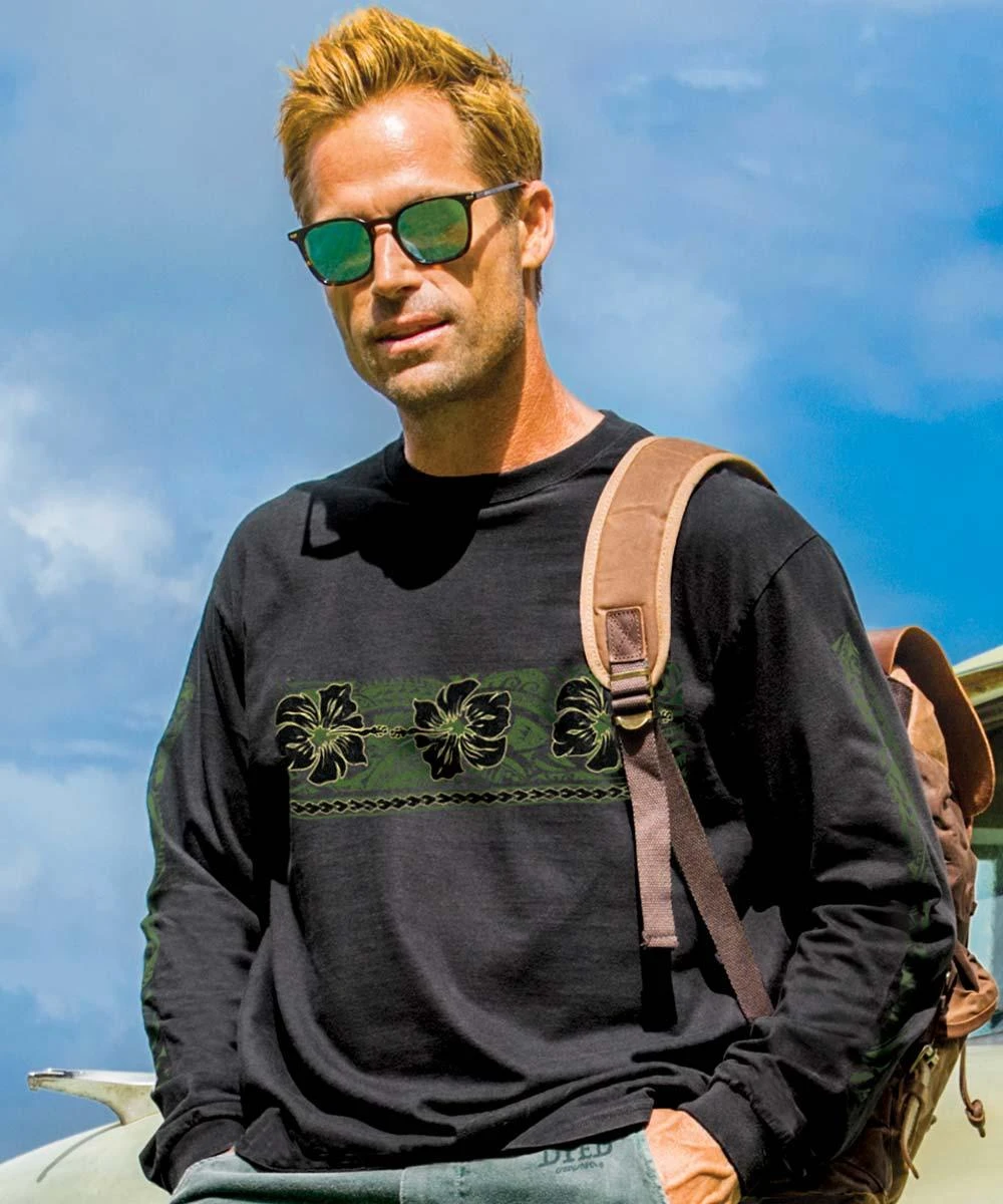 Usually you see hibiscus flowers portrayed in bright colors but seeing them in black gives them an even more powerful feeling. Placed on a classic linear band, they create a stunning tableau that brings elegance and mystery to your island style. Made from 100% cotton that is ring-spun then combed to remove impurities, this fabric is luxuriously soft and lightweight yet incredibly strong. We only use environmentally friendly water-based inks that penetrate the material’s fiber resulting in more vibrant colors, softer feel and artwork that doesn’t crack or peel. Plus, it is proudly printed in the United States for quality you can see and designs that stand the test of time.
