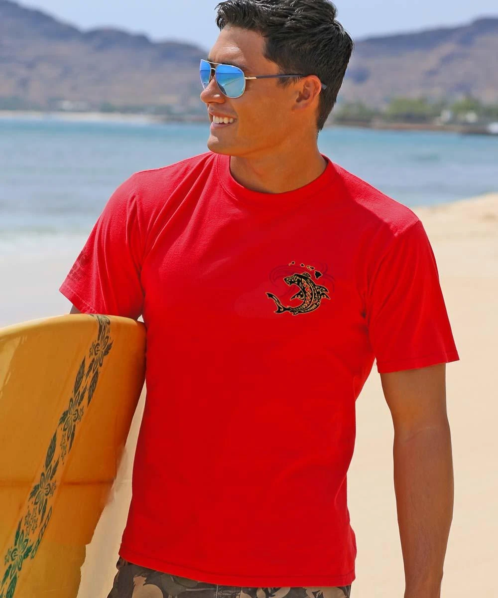 Around the islands, there’s no mistaking it when you see the powerful hammerhead shark thanks to their uniquely shaped heads. Just as special, this shirt shows these amazing creatures in all their glory thanks to the tribal-style artwork that conveys their connection to Hawaii. Made using our exclusive specialty Candy Apple Red dyeing process and featuring 100% combed ring-spun cotton, this t-shirt has 50+ SPF protection to keep you feeling cool, calm, and protected all year long. We only use environmentally friendly, water-based inks that penetrate the material’s fiber resulting in more vibrant colors, softer feel and artwork that doesn’t crack or peel. Plus, it is proudly printed in the United States for quality you can see and designs that stand the test of time.