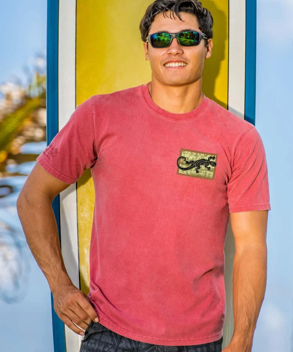Want to raise your game? Then this colorful gecko design that truly stands out against the Paradise Red-dyed material is the way to go. Made using our exclusive Paradise Red specialty dyeing process and featuring 100% combed ring-spun cotton, this t-shirt has 50+ SPF protection to keep you feeling cool, calm and protected all year long. We only use environmentally friendly water-based inks that penetrate the material’s fiber resulting in more vibrant colors, softer feel and artwork that doesn’t crack or peel. Plus, it is proudly printed in the United States for quality you can see and designs that stand the test of time.