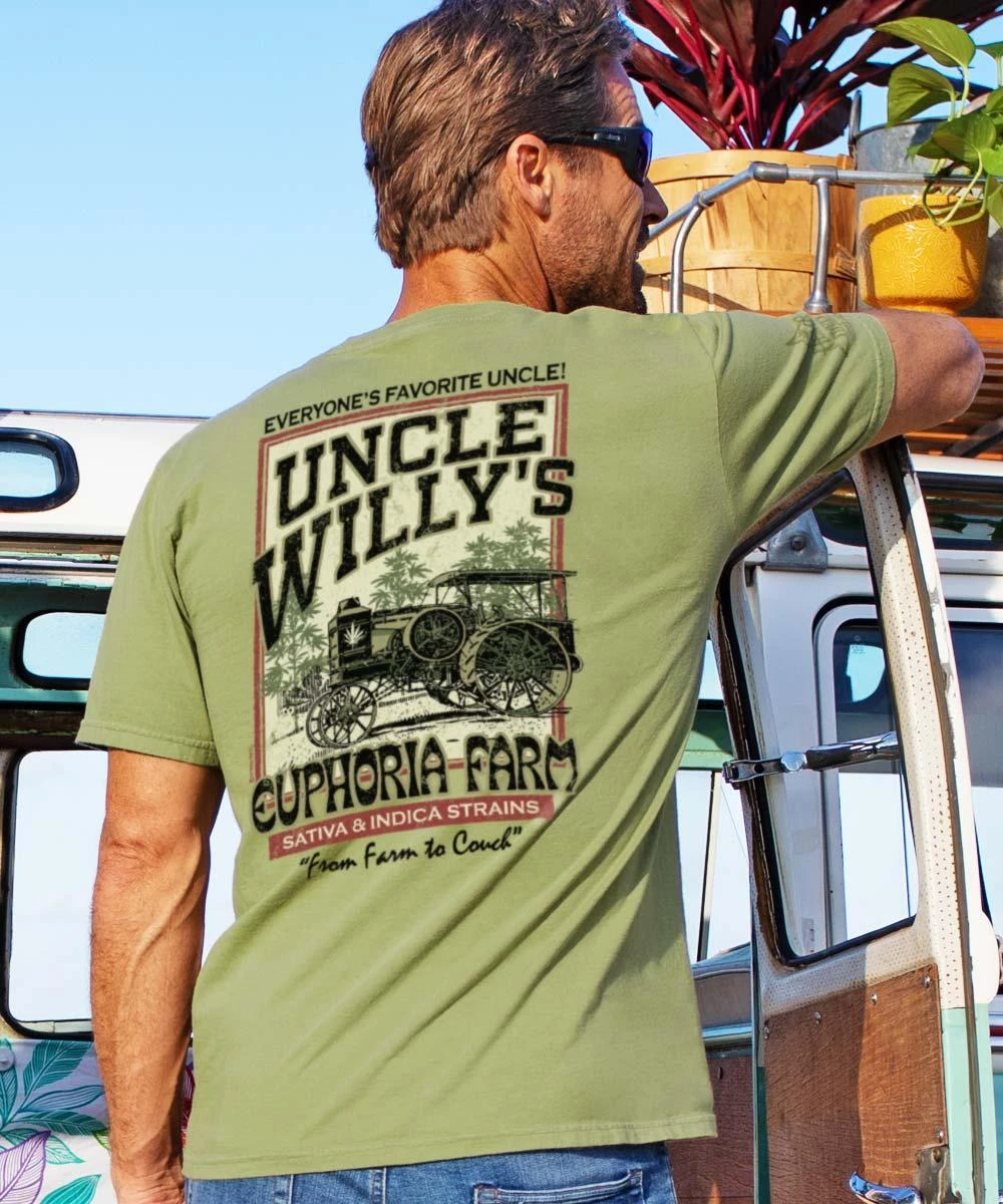 Everyone’s got an uncle like Uncle Willy, the green sheep of the family. He’s puts in the work on the farm so he can have high times at home in this hemp dyed tee. Made using our exclusive specialty dyeing process that uses real industrial hemp and featuring 100% combed ring-spun cotton. This t-shirt also has 50+ SPF protection to keep you feeling cool, calm and protected all year long. We only use environmentally friendly water-based inks that penetrate the material’s fiber resulting in more vibrant colors, softer feel and artwork that doesn’t crack or peel. Plus, it is proudly printed in the United States for quality you can see and designs that stand the test of time.