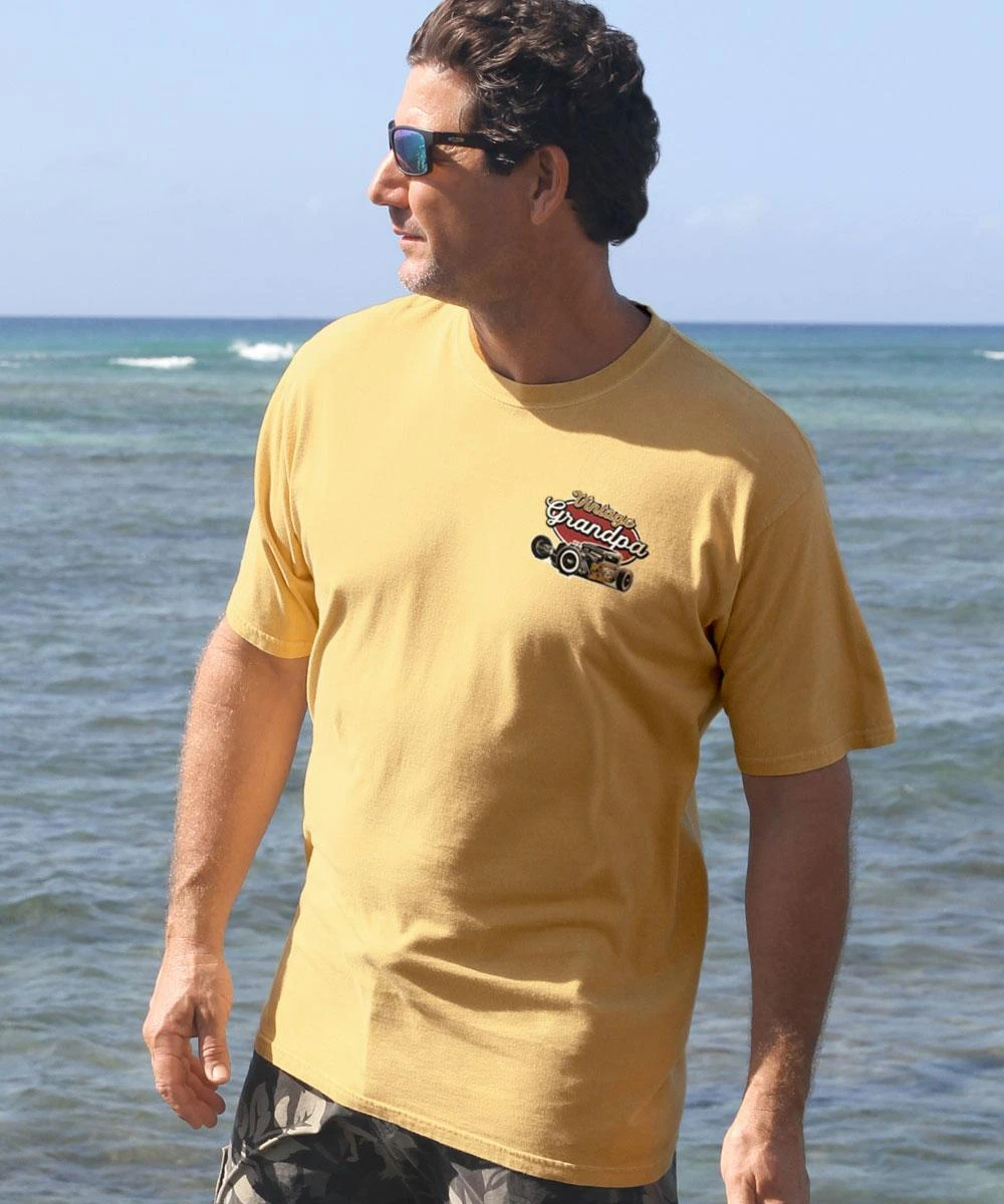 When grandpa tells you they don’t make ’em like they used to he talking about him. This shirt shows he still likes to drive fast and have fun just like the good old days, and he’s probably told you that as well. Made using our exclusive specialty dyeing process that uses real pale ale and featuring 100% combed ring-spun cotton, this t-shirt has 50+ SPF protection to keep you feeling cool, calm and protected all year long. We only use environmentally friendly water-based inks that penetrate the material’s fiber resulting in more vibrant colors, softer feel and artwork that doesn’t crack or peel. Plus, it is proudly printed in the United States for quality you can see and designs that stand the test of time.