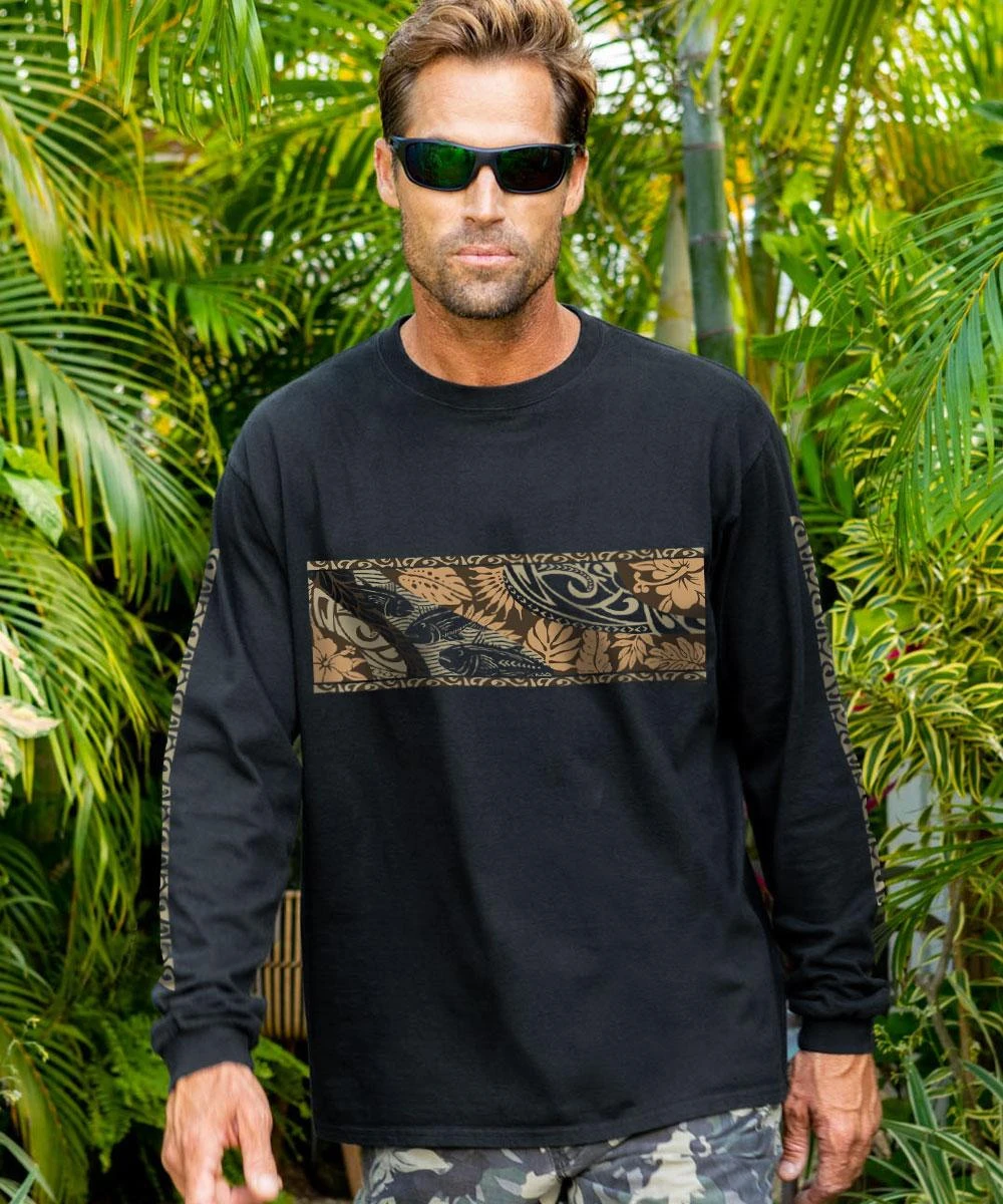 The Hawaiian belief that everything is connected is alive and well in this design featuring the interplay between elements from both land and sea. Against a black backdrop, the bold tribal-style and block imagery shows respect to island culture and shows off your powerful personality. Made from 100% cotton that is ring-spun then combed to remove impurities, this fabric is luxuriously soft and lightweight yet incredibly strong. We only use environmentally friendly water-based inks that penetrate the material’s fiber resulting in more vibrant colors, softer feel and artwork that doesn’t crack or peel. Plus, it is proudly printed in the United States for quality you can see and designs that stand the test of time.